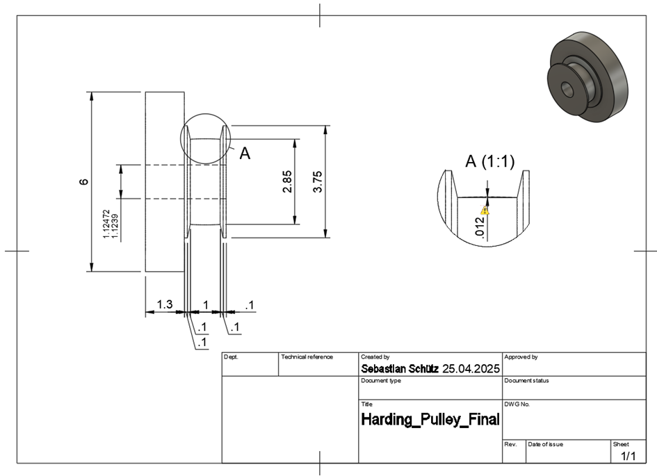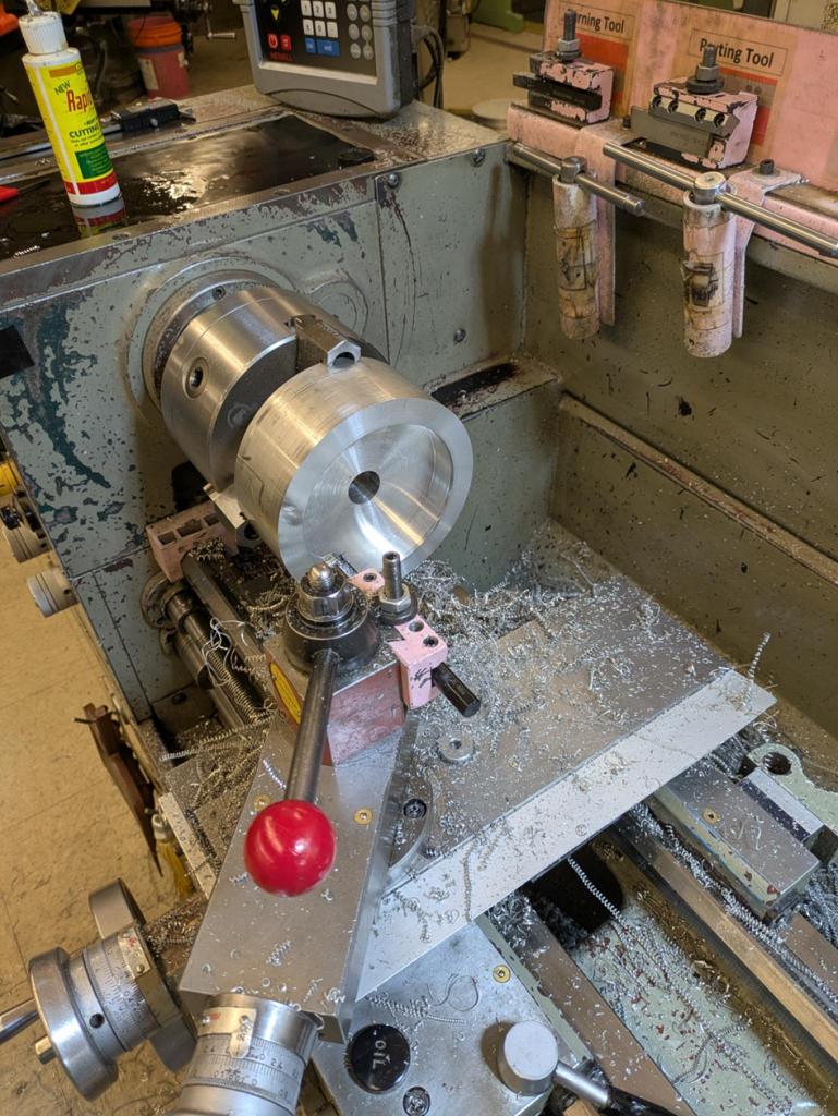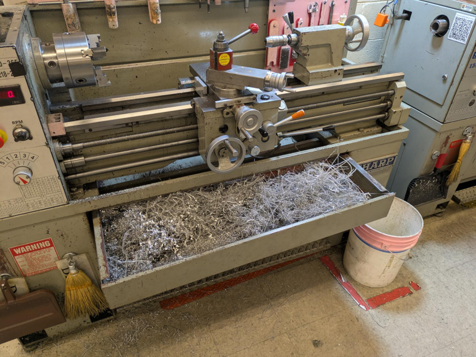 As one can see, we only added tolerances for the bore in the middle, as the rest is technically not that critically. We decided to replicate the original pulley, designed for a flatbelt as close as possible. Thankfully Sebastian was in the US at that moment and had access to the machine shop of the University. So we turned a lot of aluminium into chips: